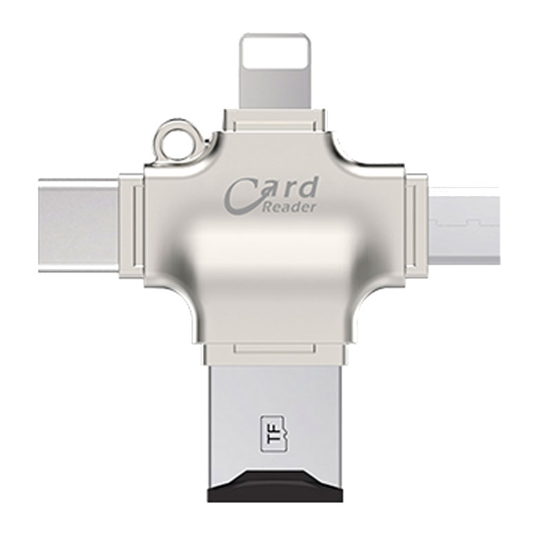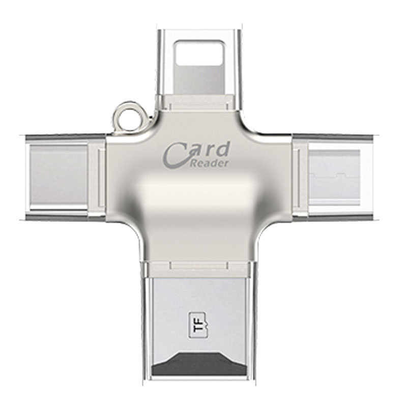 У картридера металлический корпус крестообразной формы. Он компактный – 4х4 см, поэтому его удобно носить с собой. Чтобы картридер не потерялся, повесьте его на шнурок или цепочку – для этого на корпусе есть специальная петля.