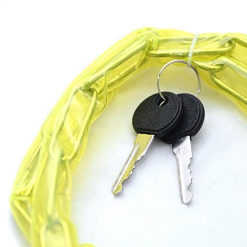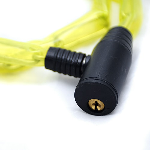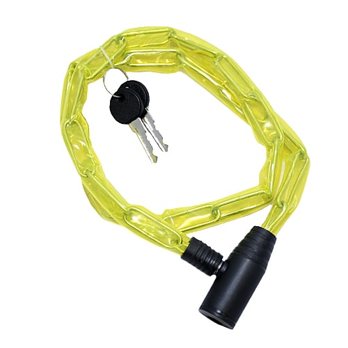 Велозамок представляет собой стальную цепь в полупрозрачной полиуретановой оплетке. Цепь сложнее перекусить, чем трос. Однако такой замок менее гибкий. Диаметр звена этого замка - 3 мм.